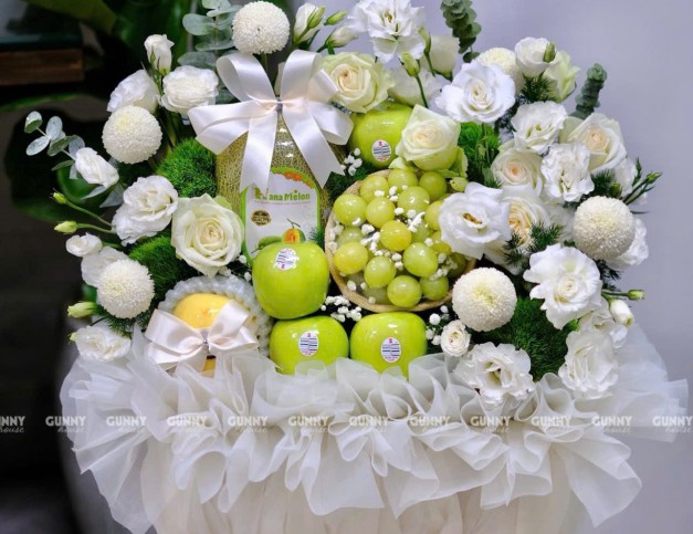 các loại trái cây nhập khẩu được mix cùng hoa tươi tone trắng