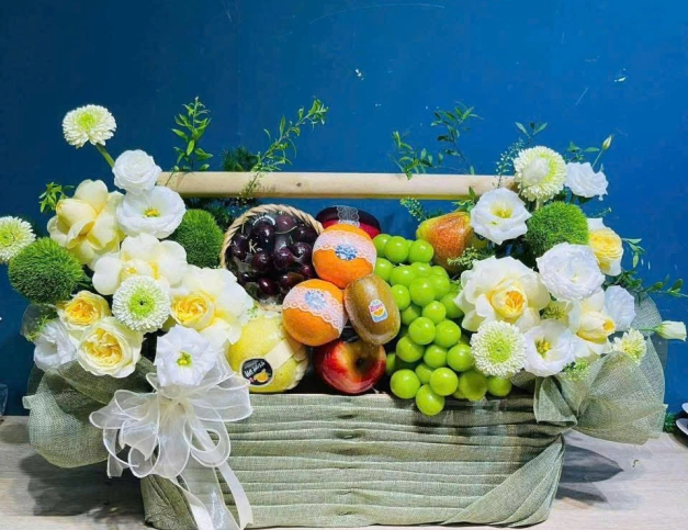 các loại trái cây được sắp xếp trên giỏ gỗ chữ nhật đầy đặn, mix kèm hoa tươi tone xanh - trắng tạo cảm giác hài hòa, nhã nhặn