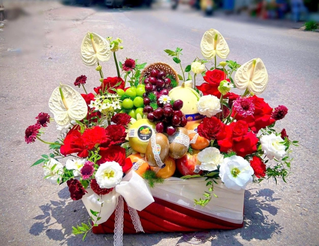 các loại trái cây được mix chung với các loại hoa tone đỏ trắng, tạo nên tổng thể rực rỡ, sang trọng