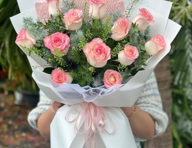 Hoa hồng hỷ được phối trên nền lá làm nổi bật sự xinh đẹp của nó