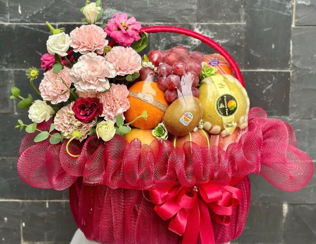 các loại trái cây nhập khẩu mix kèm hoa tươi tone đỏ mix hồng
