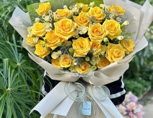 Bó hoa hồng với tone vàng rực rỡ, điểm một vài cành hoa trắng nhỏ xinh xắn, là món quà dành tặng cho người thân yêu trong các dịp sinh nhật, chúc mừng, tốt nghiệp,...