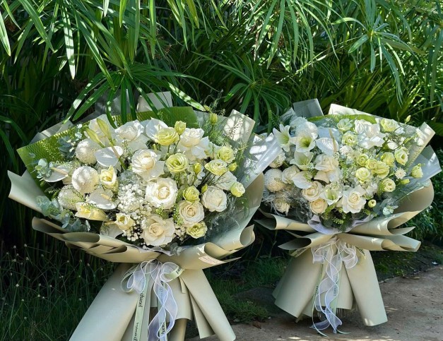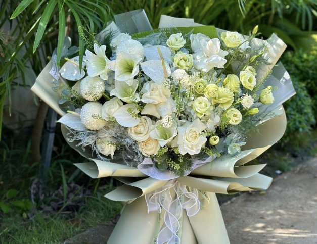 bó hoa được kết hợp từ nhiều loại hoa khác nhau với tone xanh trắng là đạo, tạo tổng thể hài hòa mát mắt và mới lạ