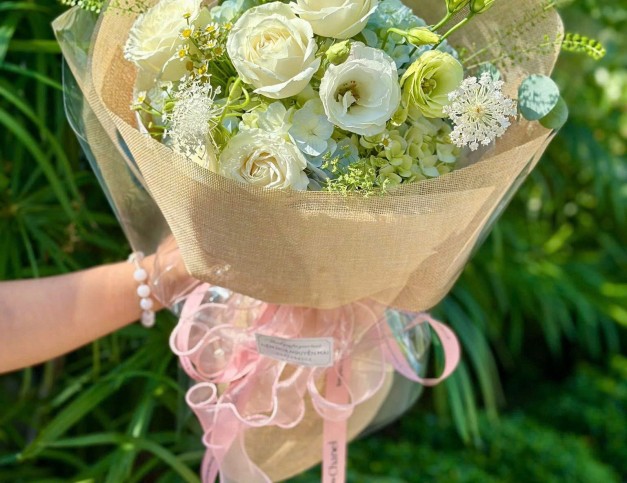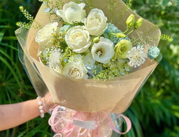 hồng trắng kết hợp với cẩm tú cầu, bó hoa nhỏ xinh, đáng yêu dành cho người thương