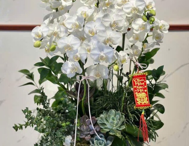 một chậu hoa xinh xắn được kết từ những cành hồ điệp trắng tinh, điểm thêm một vài bông sen đá cùng cành lá xanh, tạo nên tổng thể hòa hợp, thích hợp làm quà tặng cho mọi dịp lễ tết, kính giỗ, kính lễ, kính viếng,...