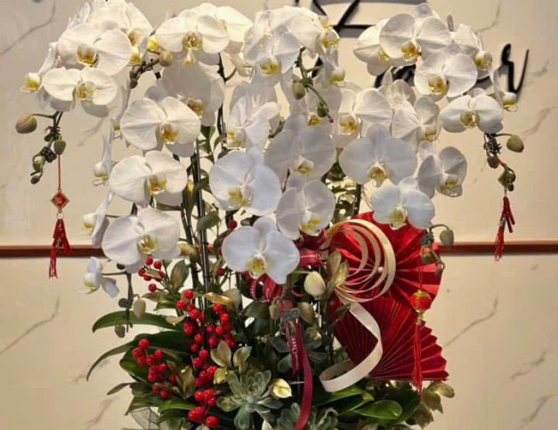 một chậu hoa được tạo nên từ các cành lan hồ điệp trắng là chủ đạo, kèm theo một số phụ kiện tạo cảm giác sang trọng, tinh tế