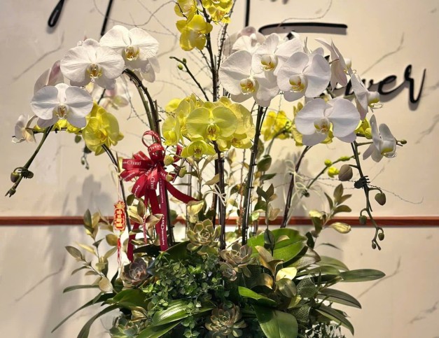 Chậu hoa được kết từ 10 cành hồ điệp mix màu trắng - vàng, tạo sự sang trọng tinh tế trên nền lá và cỏ điểm trang trí