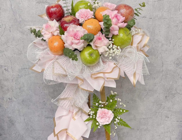 Hoa quả được kết hợp nhau trên một chân kệ mini, vừa hiện đại vừa xinh xắn mà sang trọng