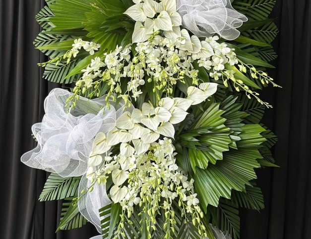một kệ viếng theo phong cách hiện đại, hoành tráng được kết hợp từ lan trắng và hồng môn trắng, tạo sự chia buồn sâu sắc nhưng vẫn rất tinh tế